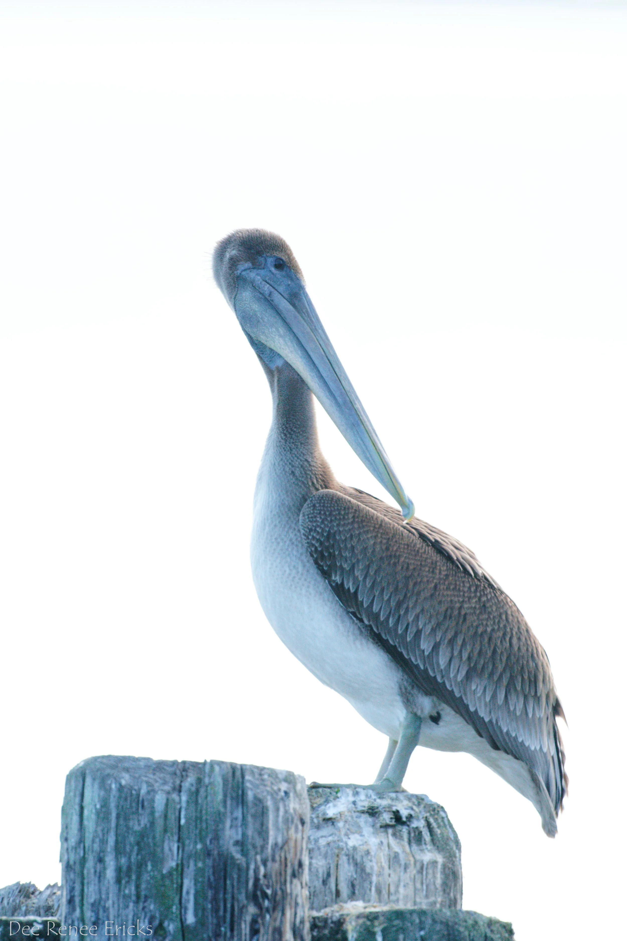 A Brown Pelican hangs out on pilings in Port Angeles Harbor. Photo by Dee Renee Ericks