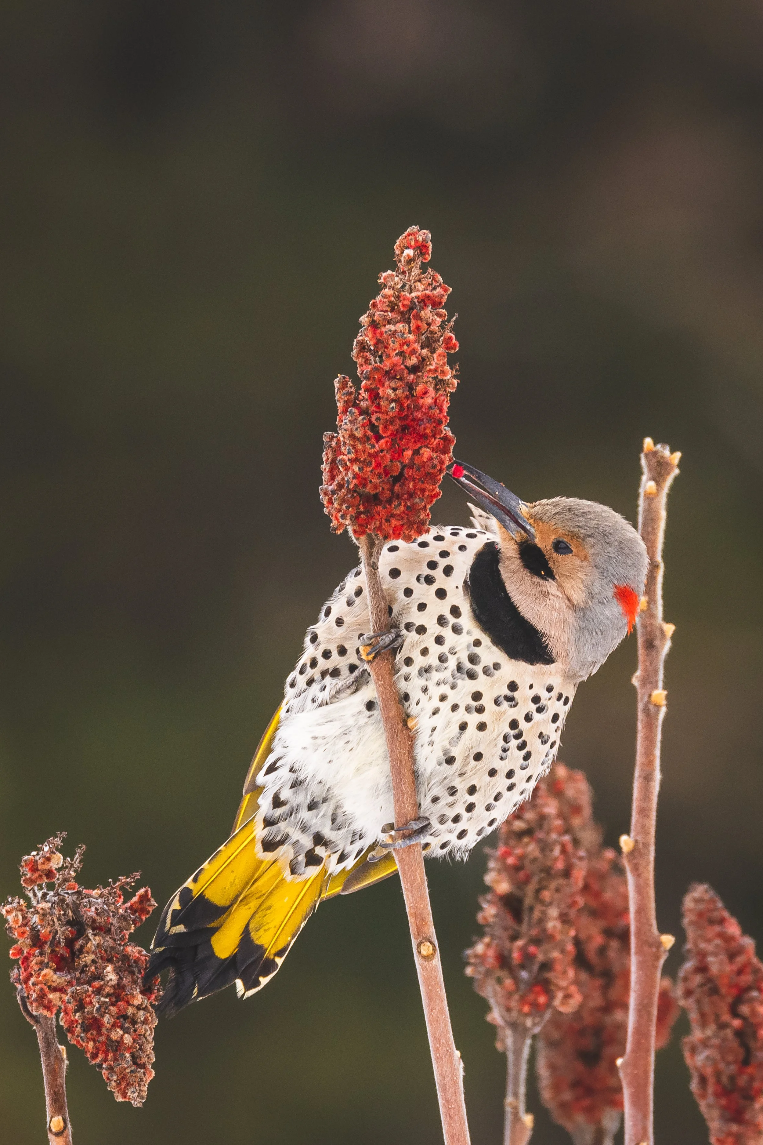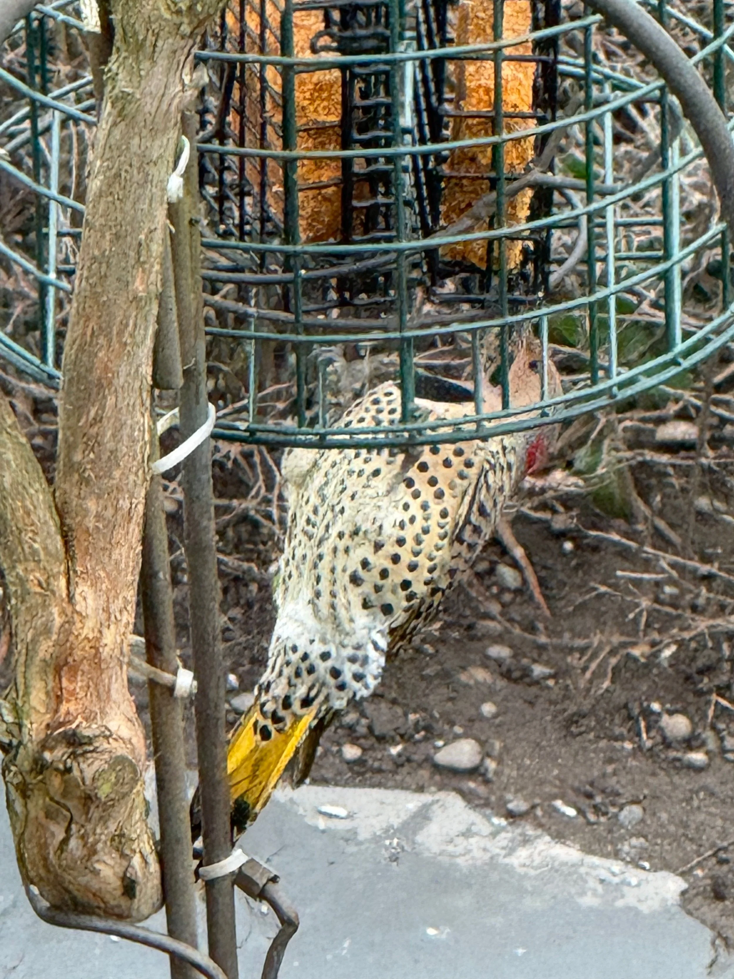 Before 1982, Red-shafted and Yellow-shafted Flickers were separate species. In 1982, the American Ornithologist Union lumped the two morphs into one species called “Northern Flicker,” because the two types freely hybridized and the hybrids are fertile. The intergrades can be any combination of either Red-shafted or Yellow-shafted characters, along with typically orange shafts and feathers in the wings and tail. It’s thought that many of the intergrades found here in winter come from an area where Red-shafted and Yellow-shafted types overlap in northern British Columbia and Alberta.