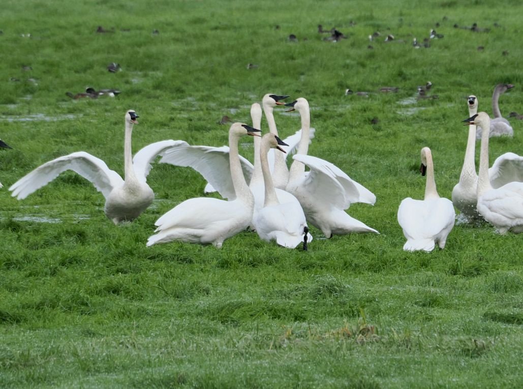 An animated and vocal party of Trumpeter Swans arrive to wet pasture along Chimacum Creek south of Port Townsend, December 2. Photo: Wendy Feltham
