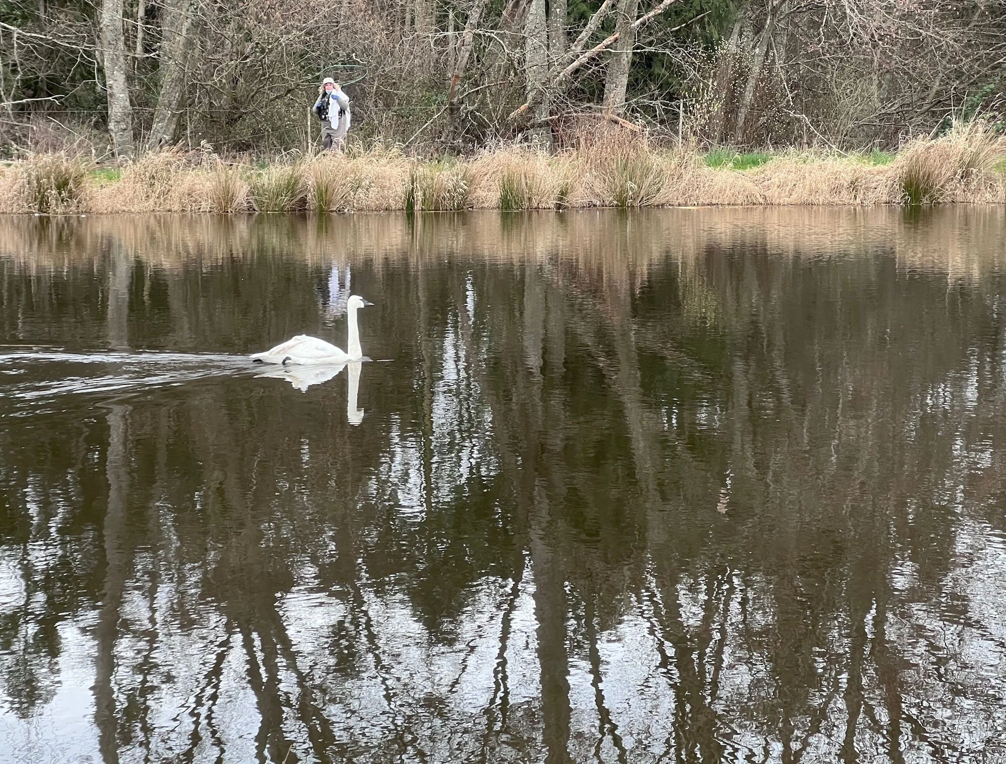 Late winter took on its own drama in our OPAS swan-team world. Where swans found daytime open water and safe overnight haven on a small irrigation pond, watchful neighbors alerted us to a Trumpeter adult remaining on the pond through the day. Our team monitored this swan and its watchful and clearly devoted family for about ten days. We helped form the bridge between the empathic neighbors and WDFW staff who knew the swan would have to be significantly weakened to be moved from the pond toward possible treatment. It took dedicated regular observation to see the slow progression of symptoms, which pointed away from injury or avian influenza, and toward lead poisoning.