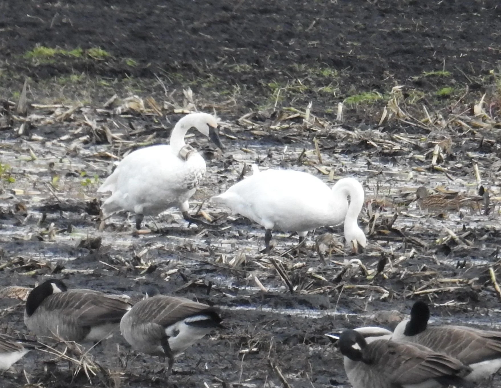 Two Trumpeters on a Vancouver Island field of harvested corn, shiny with surface water on November 3, 2025. This GPS collared WDFW–CalPoly Humboldt study swan had overwintered in Sequim from December 2024 to March 2025. Photo: Jody Wells