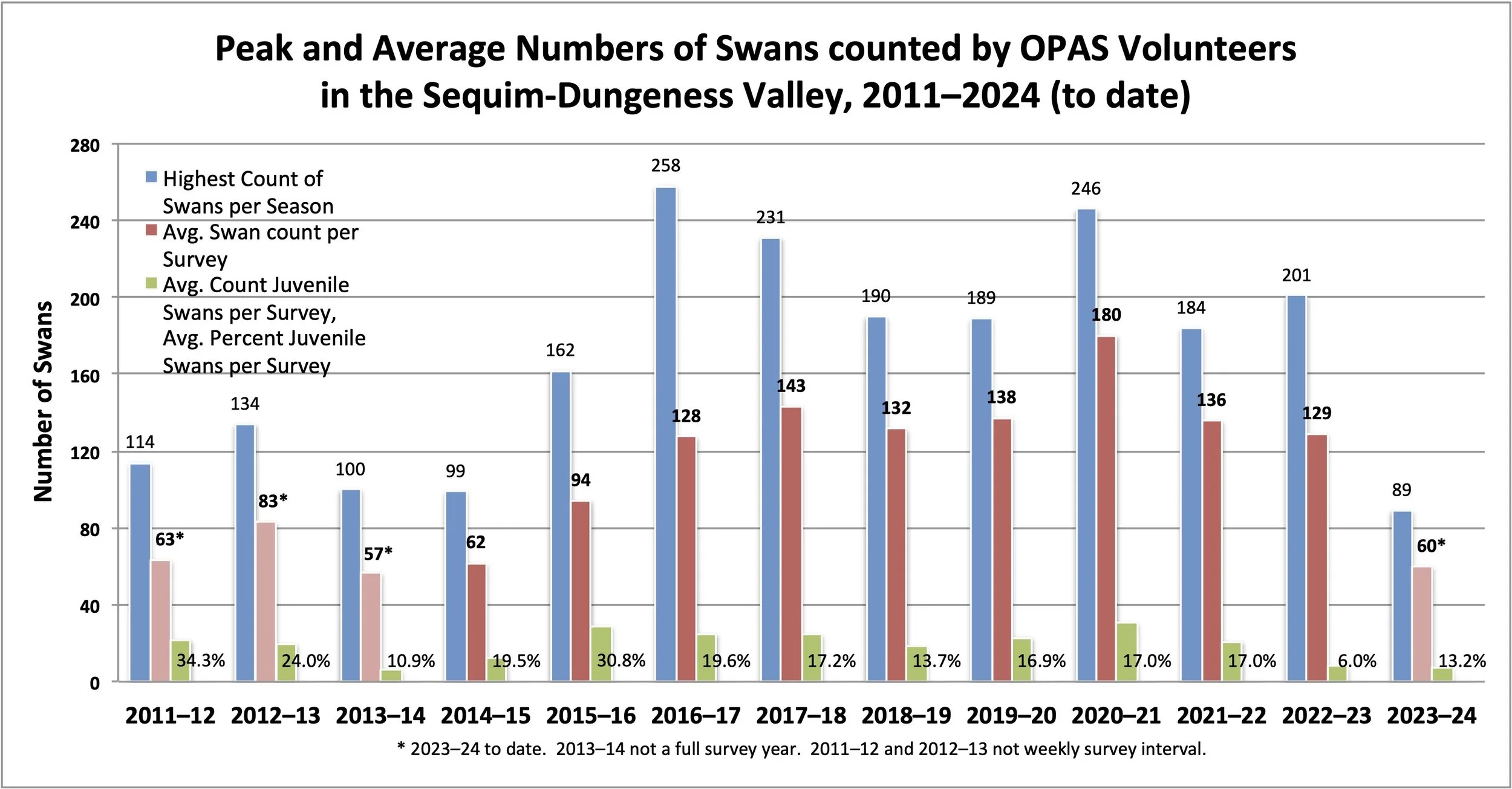 Migrating birds move seasonally partly as a response to environmental conditions. Our early-season high counts of swans were likely due to early freeze-up in the northern portion of the Pacific Flyway that accelerated the southerly migration. The fact that we experienced not only earlier arrivals here but higher counts of both swan species may relate to the migration route. Swan families accustomed to flying over central British Columbia may have averted from the cold inland temperatures and followed the warmer coast. Flying along Vancouver Island or the west side of mainland British Columbia, both Trumpeter and Tundra Swans would cross the Strait of Juan de Fuca to arrive in our Lower Dungeness area. While we are at the southern end of the Trumpeter Swans' range, Tundra typically pass over the east side of Puget Sound on their flight path south to central California overwintering grounds. Although site fidelity is common in the migrational swans, most will have experienced different routes and stopover sites in different years due to variable conditions. Changes to the breeding grounds may also cause swans to explore new migration routes that connect up with established ones, according to Martha Jordan of the Northwest Swan Conservation Society. All along the route of travel and on the overwintering grounds, habitat loss can cause swans to keep moving in search of more favorable conditions.